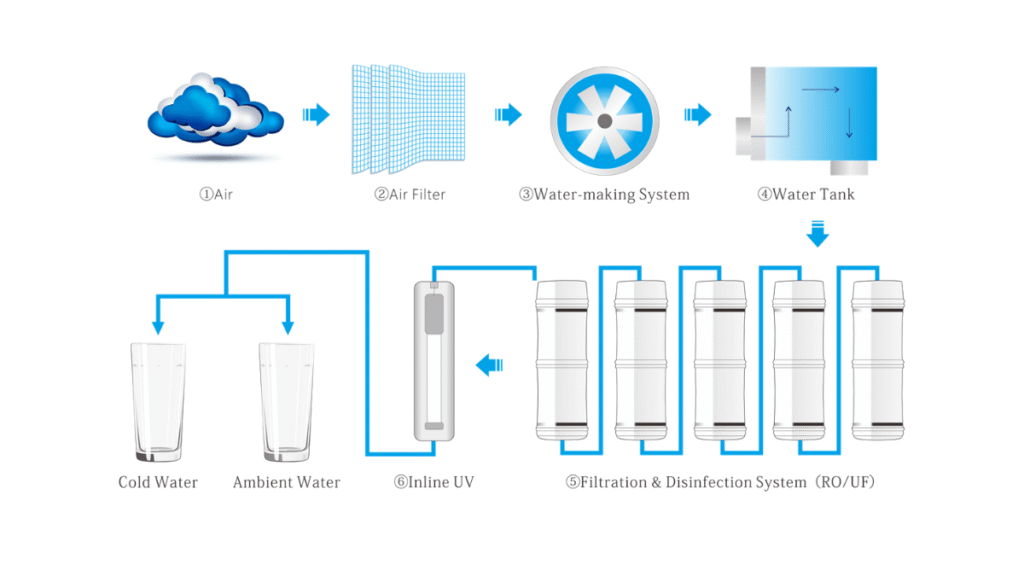 HydroCore systems extract humidity from the atmosphere, condense it into water, and process it through multi-stage filtration, UV disinfection, and mineralisation, delivering safe, great-tasting drinking water on demand