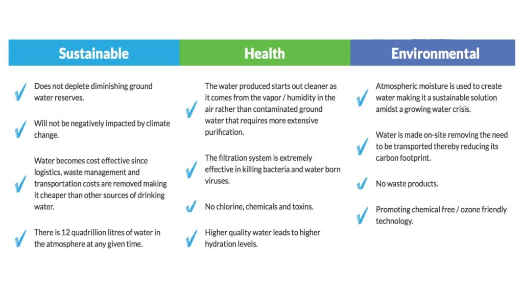 With over 15 quadrillion litres of water present in the atmosphere at any given time, AWG harnesses a truly renewable resource